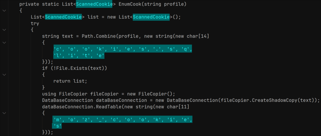El código está escrito en .NET. Tras descompilarlo, podemos observar varias funciones. Una de ellas está escrita para robar cookies de la base de datos SQLite de un navegador. Esto facilita el acceso a las sesiones activas de correo electrónico y banca.