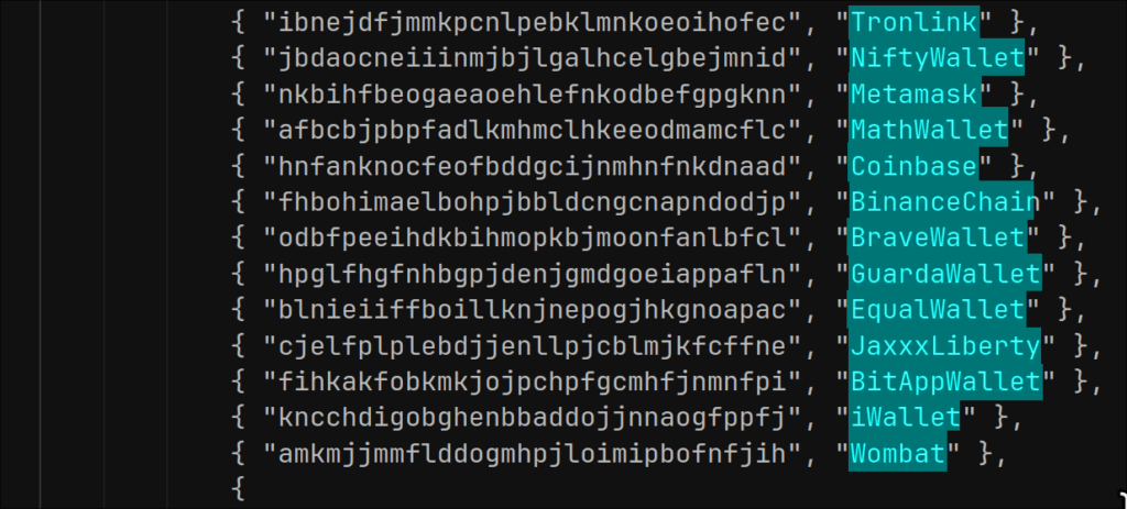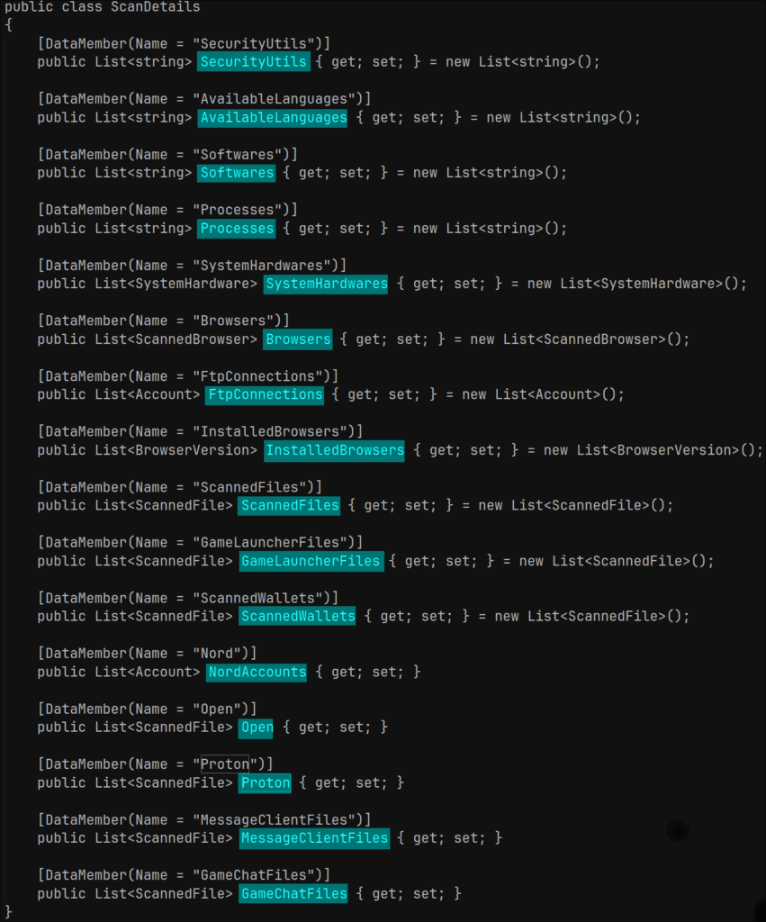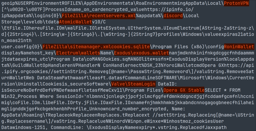 Al analizar más a fondo el código, podemos ver una lista completa de servicios de los que el malware extraerá datos. Esto incluye navegadores, juegos y servicios VPN: