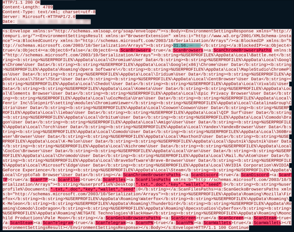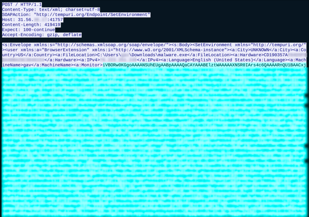 En cuanto se ejecuta el malware, se recopilan datos y se envían a un servidor C2 remoto controlado por los actores de la amenaza. Inicialmente, se establece un protocolo de enlace entre el equipo infectado y el servidor C2. Todos los mensajes se transfieren mediante el protocolo de mensajería SOAP: