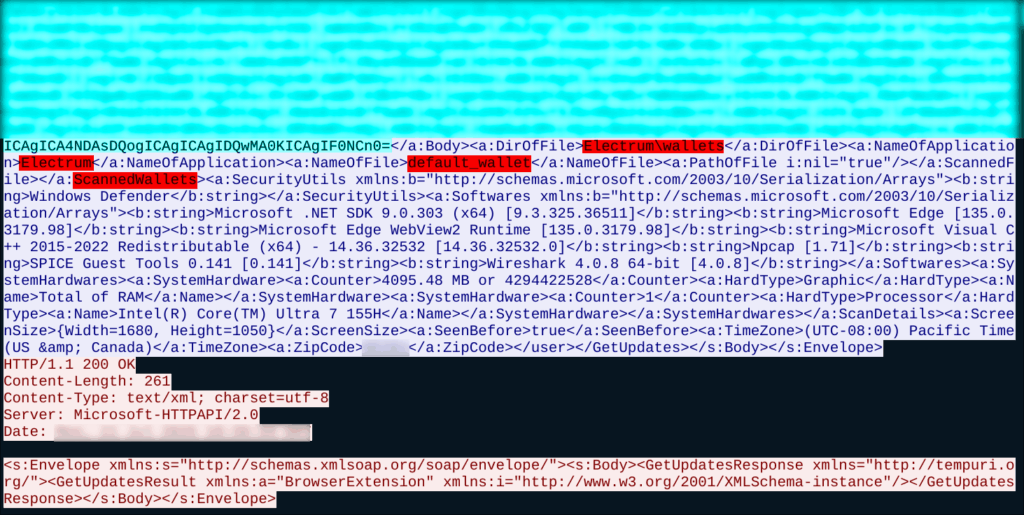 Teníamos instalada en el sistema una billetera Electrum (para análisis de malware). Se observó el envío de estos datos al servidor C2: